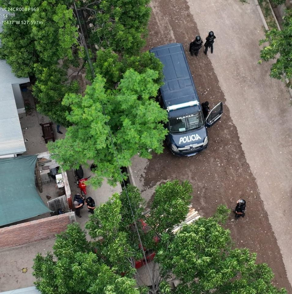 La intervención contó con apoyo aéreo de la Unidad de Vehículos Aéreos No Tripulados (VANT) Zona Sur, cuyas imágenes en tiempo real permitieron monitorear los movimientos en el lugar y coordinar el ingreso del personal en tierra. También, participaron efectivos de Cuerpos Especiales de General Alvear, que brindaron cobertura en el perímetro durante el operativo.