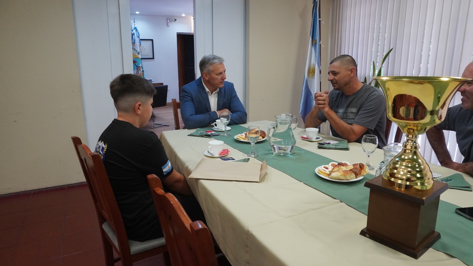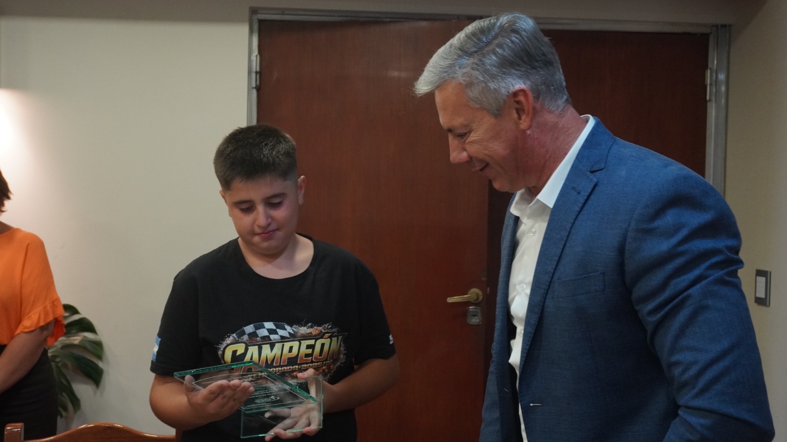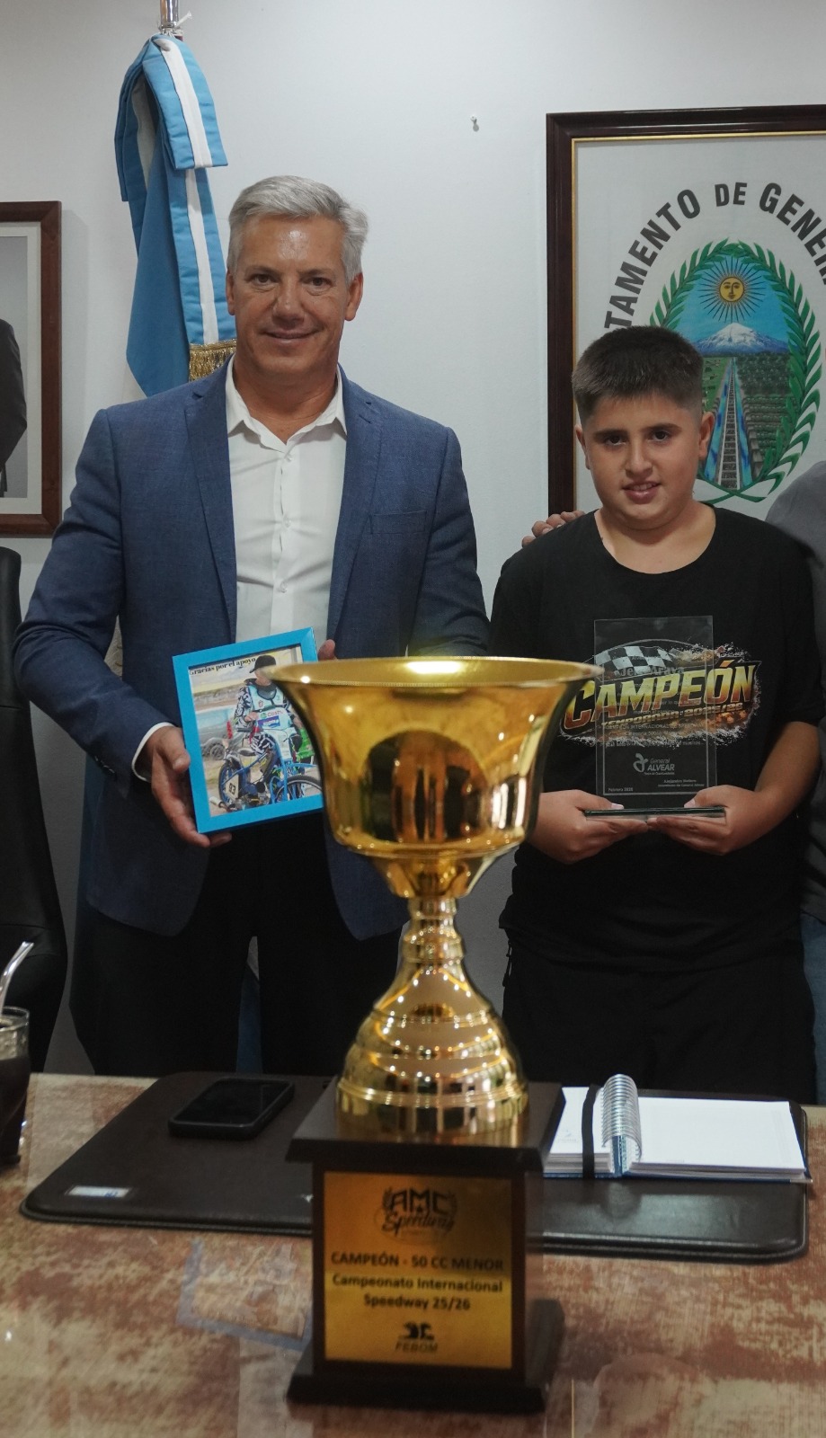 El intendente Alejandro Molero recibió y entregó una distinción al joven piloto alvearense Jeremías Araya, quien el último fin de semana se consagró campeón en la categoría 50 cc en el Campeonato Internacional de Speedway en Bahía Blanca.